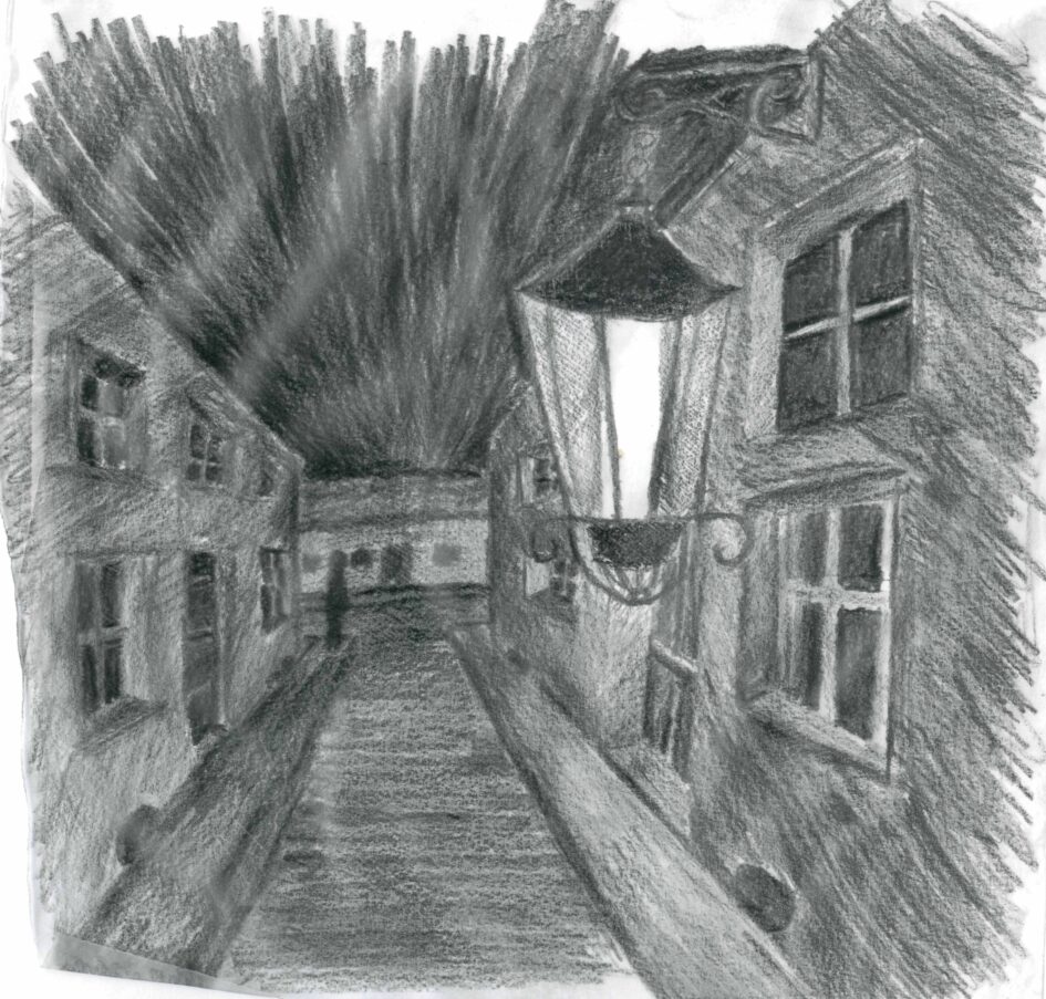 Ich wollte die Athmosphäre des Folgenden Bildes Nachahmen, die Laterne habe ich zuvor skizziert: